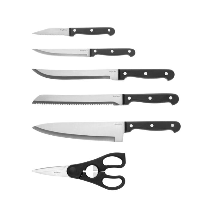 - Among them: the bread knife, chef's knife, carving knife, utility knife, paring knife, and kitchen scissors showcase high-quality stainless steel blades, meticulously hand-sharpened to maintain enduring sharpness.