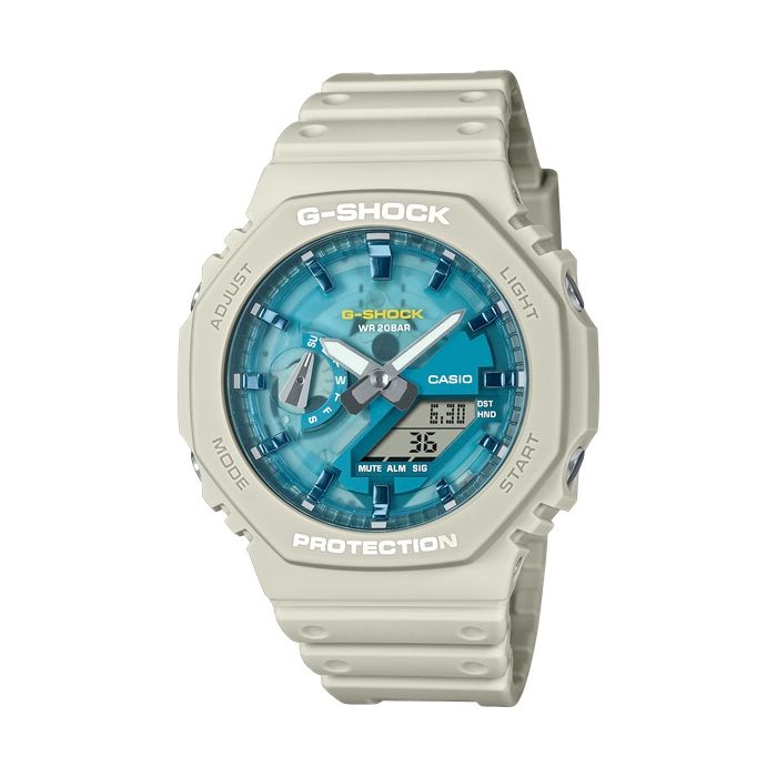 - G-Shock - GA-2100AS-5ADR - Plunge into cool-blue waters under the blaze of the mid-summer sun with the hallmark toughness of an oasis-inspired G-SHOCK. The tough and rugged GA-110 start with a base color of navy blue. Then inspired by the refreshing sanctuary of an oasis lake, touches of blue-green accent the dial, conjuring glistening cool waters that reflect the rays of the sun. Summery seasonal colors evoke the thrill of an oasis suddenly emerging in a tropical landscape. A great casual accessory for your marine sports style or street-savviest fashion.