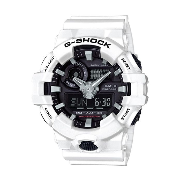 The new GA-700 analog/digital combination model. Multi-dimensional hour and minute hands look as if they were carved out of a piece of metal for a powerful and bold design. The new form of these watches not only improves reading, it also projects a feeling of toughness. A front button at 6 o'clock adds to the dynamic, leading-edge styling. The three color schemes of these models were carefully selected to reflect the brand concept. Black-and-red, black, and red capture the spirit of toughness these models are designed to represent. All the practicality of the analog-digital format, high-brightness LED illumination, a hand shift function and much more all add up to the best in timekeeping convenience. A 3D face combining with a distinctively tough design makes the new GA-700 models look dynamic and tough.