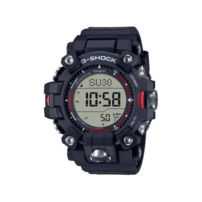 The G-SHOCK Master of G line of watches developed for professionals working in the harshest environments introduces the triple-sensor MUDMAN with mud-resist construction. The large, easy to operate front button and three direct sensor buttons on the side are shaped to drain mud and water and are protected by cylinder-shaped stainless steel components. The button shafts are equipped with gasket fittings to keep mud and dust out, as well, so you’re ready to take on the toughest of terrains. The bold design features a dual-layer LCD, as well as the Triple Sensor to deliver altitude, direction, temperature and barometric pressure readings directly to your wrist. The thin module and Carbon Core Guard structure mean all these features live in a slimmer, more compact watch, for tough and rugged support with a comfortable fit. Slim, yet powerful, this MUDMAN design packs full-on functionality in a striking exterior built with an intricate combination of components. The digital compass is more practical than ever thanks to the dual-layer LCD, which displays compass graphics on the top layer and time and other readings on the layer below. The GW-9500-3 and GW-9500-1A4 feature a negative dual-layer LCD. Taking utility to a whole new level, radio-controlled solar power delivers precision timekeeping powered by light, while Super Illuminator ensures visibility, even in dark places. The case, bezel and urethane band are made with bio-based resins derived from renewable organic resources. The case back is engraved with the iconic MUDMAN mole character holding a compass.