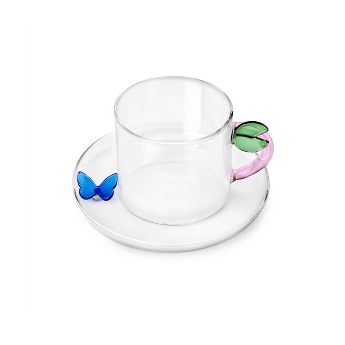 Bring a touch of nature to your table with Ichendorf Milano's (Italy) Leaf teacup from the Fruits and Flower collection. Designed by Allesandra Baldereschi, this delicate handmade clear glass teacup exudes minimalist elegance with a touch of whimsy. Paired with a matching saucer featuring a delicate blue butterfly, spice up your tableware with this unique piece.