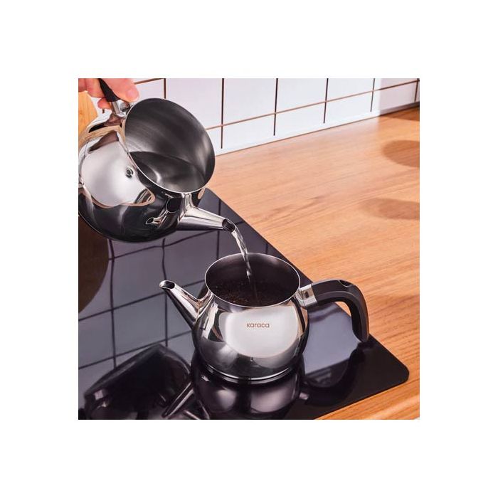 Breakfast, lunch break, indulgence, and after-dinner tea are inseparable from tea. That's why delicious and fresh tea is very important to us. The Karaca Kayra teapot set is a traditional tea brewing set with a self-filter. It features a 1-liter teapot and a 1.75-liter teapot. This teapot, with its capacity of 1.5 litters, is ideal for families of 4-6 people and is also suitable for induction cookers.