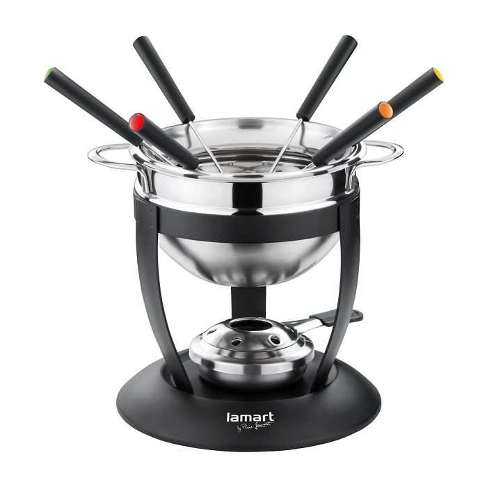 Made from first-class steel . The set includes: a stainless steel cooking container, 6 coloured forks, lid and fork holder, stand and burner. This stainless steel fondue set is excellent for the preparation and stylish serving of not only meat fondue. Easy maintenance and cleaning
