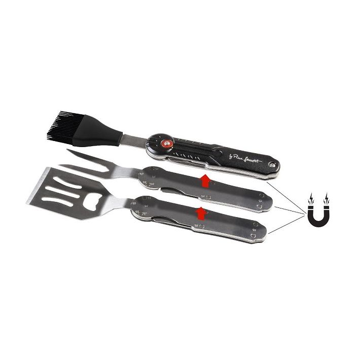 The multifunctional magnetic utensils set consists of 5 essentials for perfect grilling. Removable and telescopic utensils fork, turner, bottle opener, silicone brush and steak knife. Compact and easy to carry. Each utensil can be used separately. Always clean and wash the product by hand.