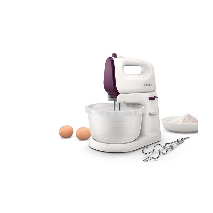 Daily Mixer with bowl: 450W, 5 speeds, 3L rotating bowl, translucent measuring bowl, easy mixer release button.